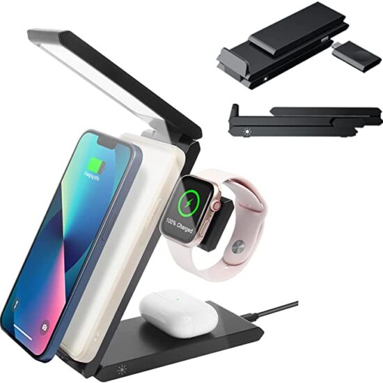 Esta elegante lámpara cargadora 4 en 1 combina diseño moderno y funcionalidad. Con base plegable, ofrece carga inalámbrica para smartphones, reloj inteligente