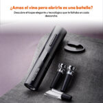 Incluye aireador para oxigenar el vino, tapones herméticos para conservarlo, cortador de cápsulas y base para mantener todo ordenado.